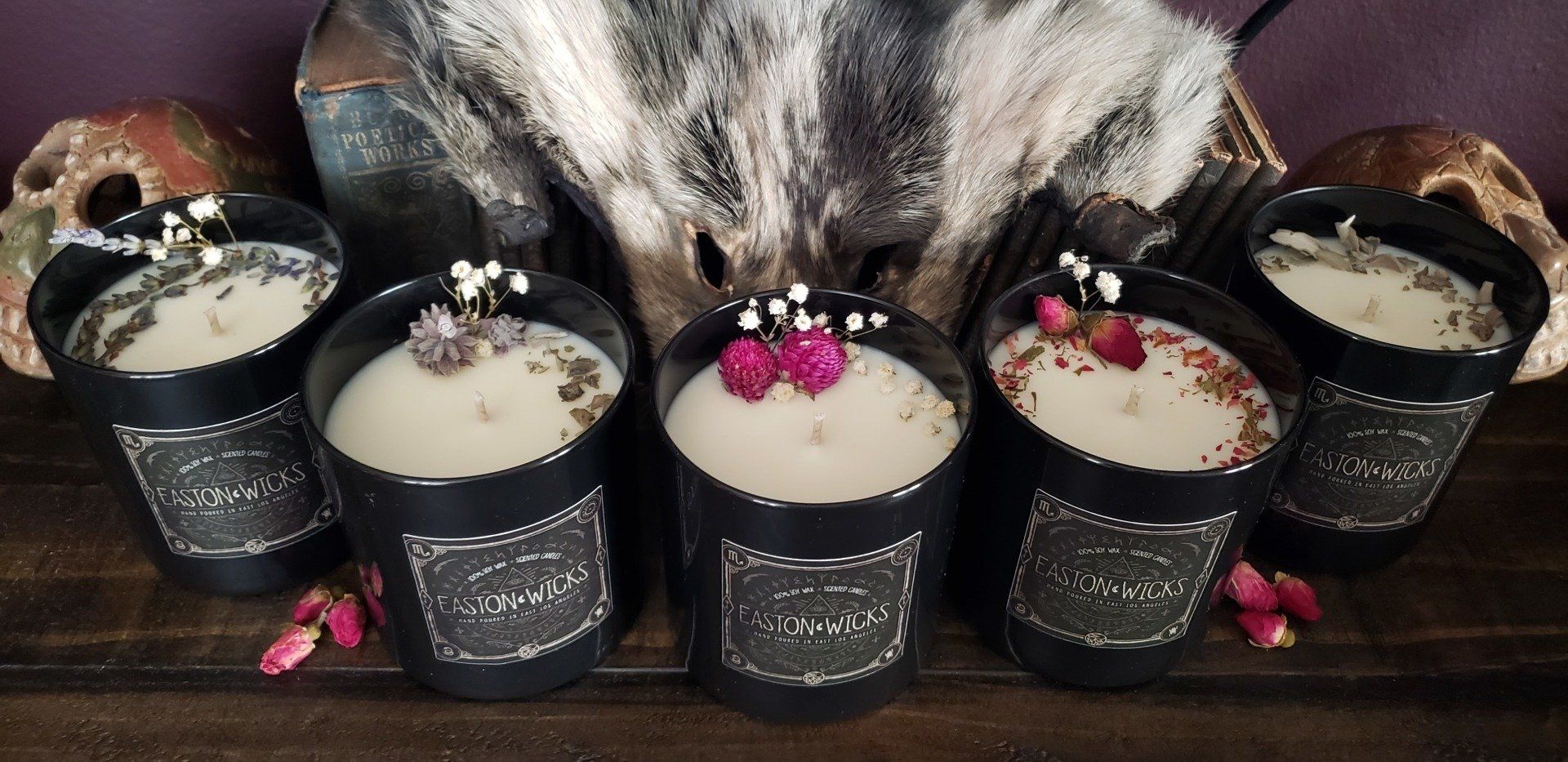 These candles are made with 100%soy wax and cotton wicks scented with natural oils and flowers. Each is hand-poured then goes through a second process to top them off with flowers, it is a delicate and timely process. These flowers burn like incense , but we do recommend to never leave any candle unattended.
